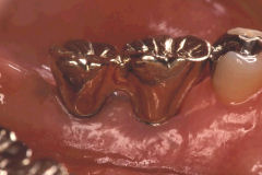 1)写真は57歳女性です。左下の大臼歯が二本とも失われています。 それまで出し入れのばね付の入れ歯を使用していましたがどうしてもなじめず、咬むと痛みがありました。 |