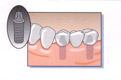 3)金属の歯が入りました。これで上の歯と奥歯でしっかり咬むことができるようになりました。 セラミック等で歯の色に仕上げることも可能です。左の図はインプラント治療のイメージです。 |